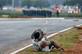 Indigenous people armed with bows, arrows & charms clashed with police in Brazil's capital,Brasilia,outside the Mane Garrincha National Stadium ,two weeks before the World Cup begins.They are protesting the hosting of the world cup by Brazil because they feel it will cost too much for a developing nation.They say the billions spent could be used to better the lives of the poor.