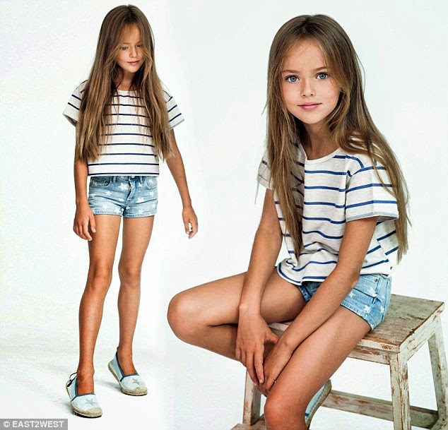 All her 'poses' are natural. She is just a little girl who is attracting a lot of attention and unfortunately some of this attention is coming from strange people with huge personal problems, keen to throw dirt at anyone.'Married to Kristina's 34 year old father, retired Russian football star, Ruslan Pimenov, she is anxious to be seen as a responsible mother and to show that her daughter is a perfectly normal girl who happens to be stunningly beautiful with long honey blonde hair, piercing azure eyes and angelic facial features.